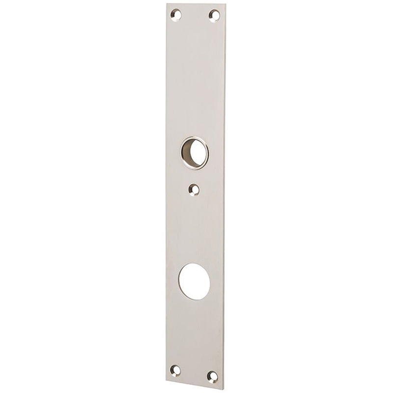 Messing matt vernickelt, Führung 16 mm, gebohrt für Schrauben M5 für paarweise Verschraubung mit Sicherheits-Aussenschild, für optische Angleichung, wenn im Innenbereich flache Schilder verwendet werden, Mitte oberes Schraubenloch bis Mitte Drückerführung 74 mm, ohne Schrauben