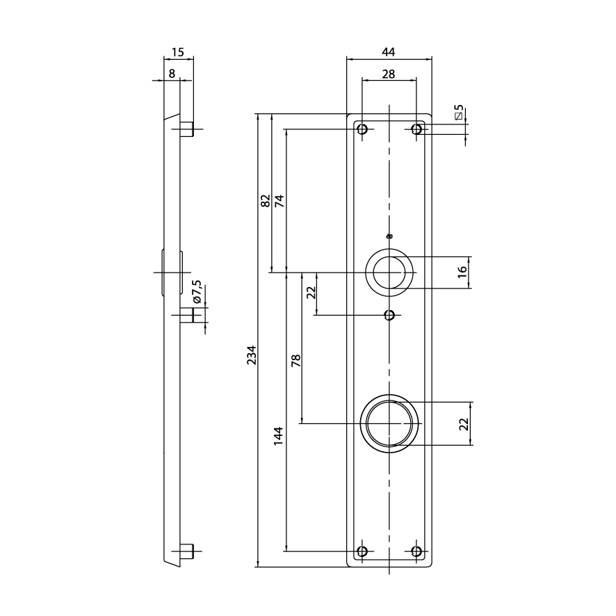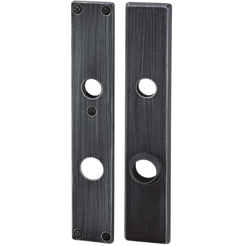 Stahl verzinkt und patiniert, Führung 18 mm mit Nylon-Reduktion 16 mm, Aussenschild mit gehärteter Stahlplatte im Zylinderbereich, mit 5 Gewindenocken M5 x 7 mm für paarweise Verschraubung mit Innenschild 5 mm, Mitte oberes Schraubenloch bis Mitte Drückerführung 74 mm, ohne Schutzeinsatz, ohne Schrauben
