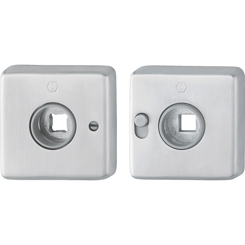 Edelstahl matt, abschliessbar durch verschiebarer Knopf, Grundplatten aus Kunststoff mit Stütznocken für paarweise Verschraubung, Schraubenlochdistanz 38 mm, mit Schrauben