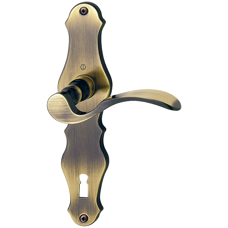 Messing brüniert, mit Schrauben, Garnitur bestehend aus Stiftteil, Lochteil und 2 Schildern