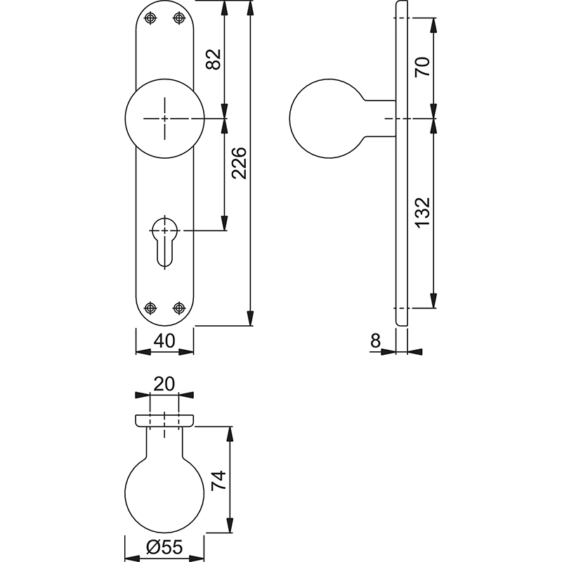 Aluminium stahlfarbig eloxiert F9, Knopf mit M12 Feingewinde, oberes Schraubenloch bis Mitte Drückerführung 70 mm, mit Holzschrauben Ø 3,5 x 20 mm