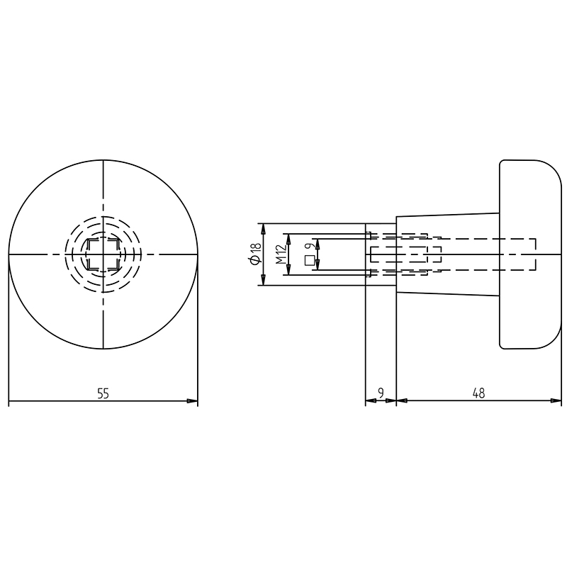 Zink matt vernickelt, fest montiert auf Drückerrosette, Vierkantloch 9 mm / M12, Aussenrosette mit Gewindenocken Ø 7,5 mm / M5, geprüft nach EN 1906, ohne Schrauben