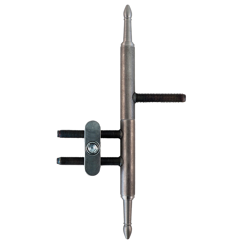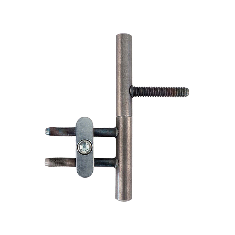 Stahl blank, 2-D verstellbar (Andruck und seitwärts), die Drehteile werden aus einem Stück gefertigt, dadurch entfallen Gewindeverbindungen oder Aufsteckhülsen, die M7 x 0,75 mm Gewindebolzen werden mit der exakt gleichen Steigung wie der Klemmblock gedreht, dadurch kann beim Einbau in kleineren Schritten feinjustiert werden, die Drehbewegung findet auf den Ringflächen der Hülse und des Dorns statt, die Flächen können ohne Ausbau geschmiert werden, es entsteht eine hohe Auflagefläche, Test intern werk14, angelehnt an RAL-Testverfahren mit einem Dauertest von 15000 Zyklen, Test mit 100 kg Zusatzlast und ein Falzhindernistest wurde erfüllt, beim Einsatz von zwei Einbohrbändern empfehlen wir ein maximales Flügelgewicht von 40 kg, bei einer maximalen Flügelbreite von 1000 mm, wird ein Wert überschritten empfehlen wir den Einsatz von 3 Bändern,