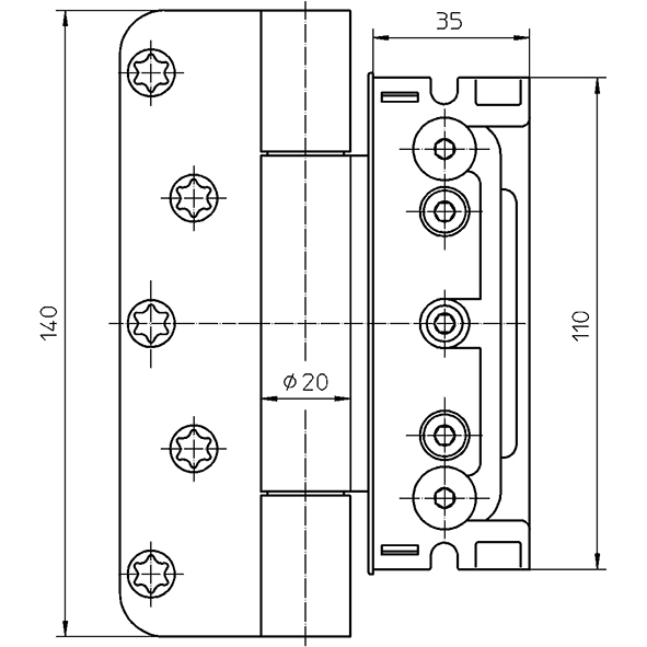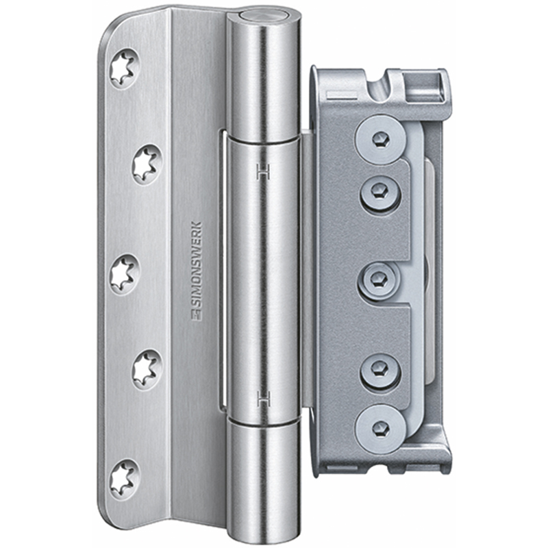 für ungefälzte Holztüren, für Falzluft 4 mm, mit wartungsfreier Gleitlagertechnik und Komfort-Verstellung, Höhen-, Seiten- und Andruckverstellung ± 3 mm, alle Verstellmöglichkeiten einstellbar auch ohne Aushängen oder Unterkeilen der Türe, mit verdeckt liegendem Aufnahmeelement im Rahmen, Belastbarkeit 120 Kilo