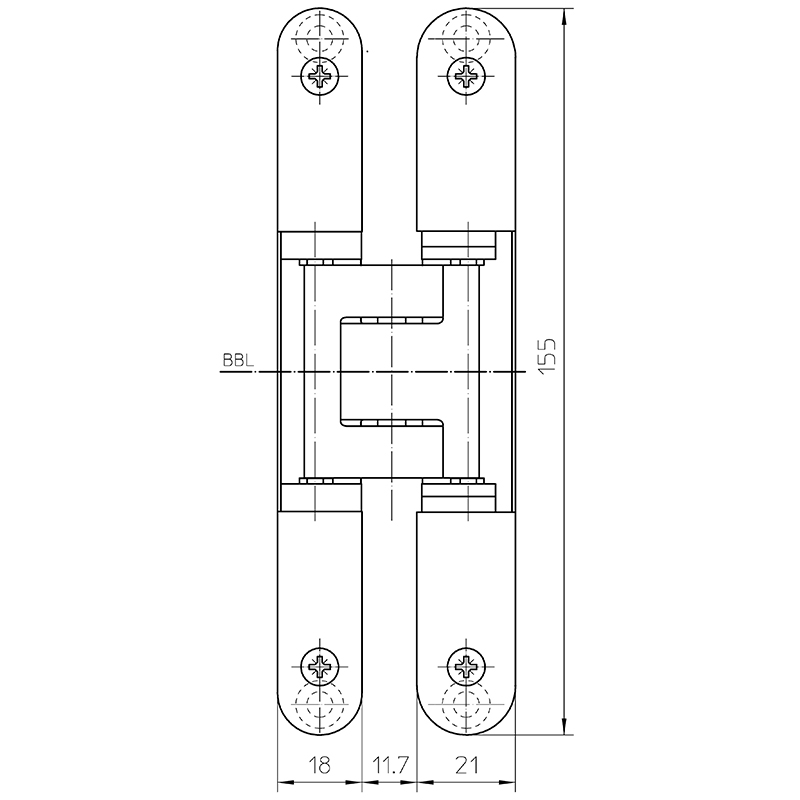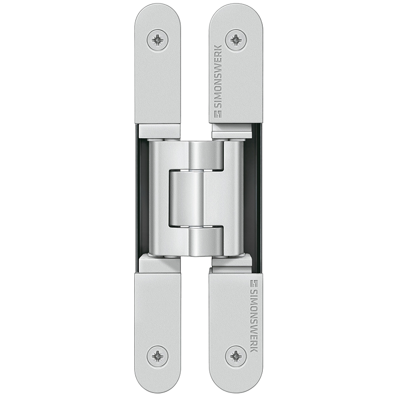 Grundmaterial bestehend aus Zinkdruckguss, Aluminium und Stahl, komplett verdeckt liegend, für ungefälzte Türen an Holz- und Stahlzargen, 3-dimensionale Verstellmöglichkeit, Seiten- und Höhenverstellung ±3 mm, Andruck ±1 mm, wartungsfreie Gleitlagertechnik, Öffnungswinkel bis 180°, Tragkraft bei 2 Band ca. 60 Kilo