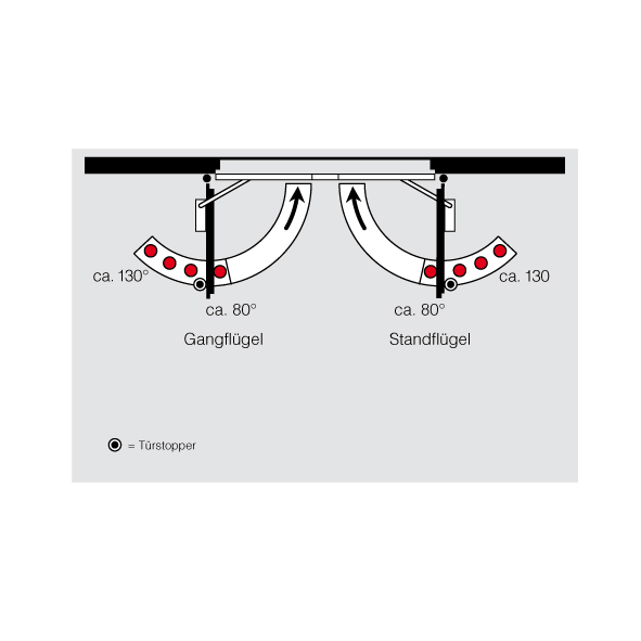 mit integrierter mechanischer Schliessfolgeregelung für 2-flüglige Türen und elektromechanischer Feststellung beider Flügel, Feststellpunkt zwischen 80° bis 130° einstellbar, der Gangflügel kann unabhängig vom Standflügel festgestellt werden, durch die werkzeuglos einstellbare Ausrückkraft kann die Feststellung auch von Hand problemlos ausgelöst werden, beim Schliessen der Tür bleibt der Gangflügel in Warteposition bis der Standflügel geschlossen ist und über die Schliessfolgeregelung den Gangflügel freigibt, Montage auf Bandseite, Betriebsspannung 24 V DC