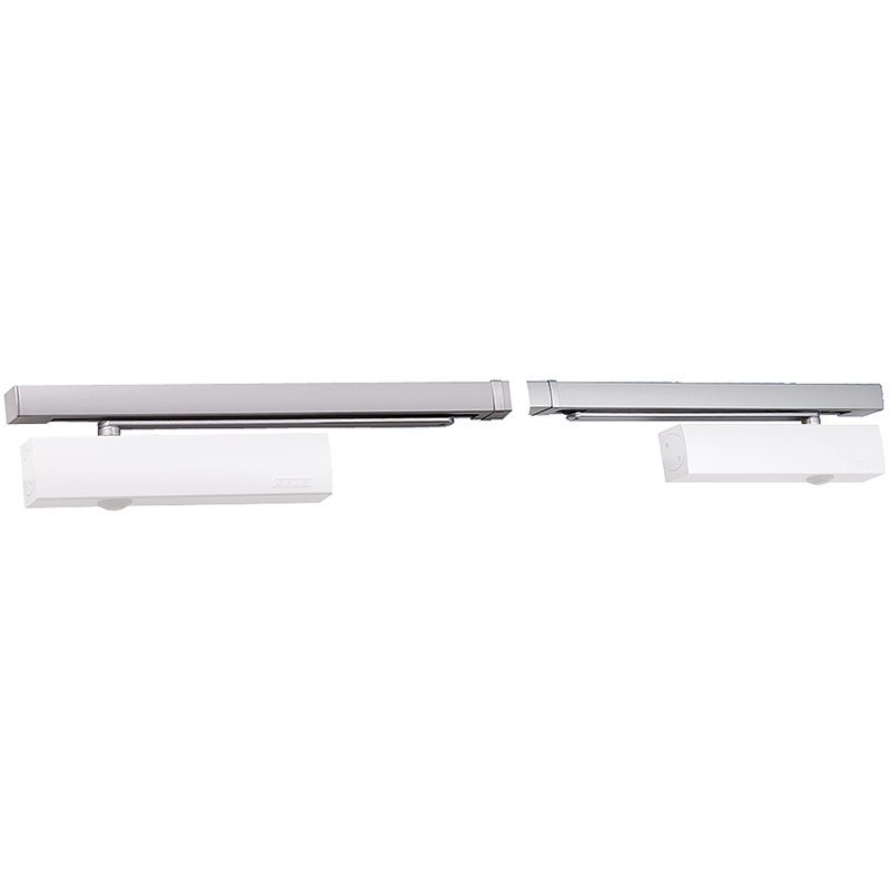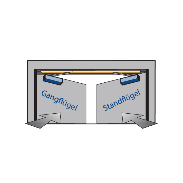 mit integrierter mechanischer Schliessfolgeregelung für 2-flüglige Türen, beim Schliessen der Tür bleibt der Gangflügel in Warteposition bis der Standflügel geschlossen ist und über die Schliessfolgeregelung den Gangflügel freigibt, Türblattmontage auf Bandgegenseite