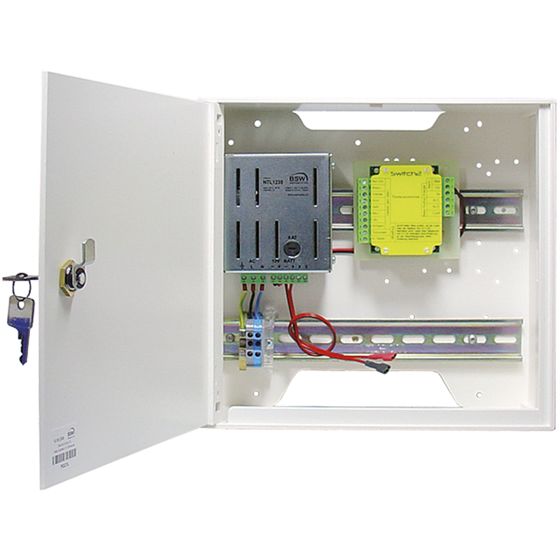 Gehäuse Kunststoff weiss, mit Netz- / Ladeteil 230 V AC, 12 V DC, 3,5 A, Betriebsspannung 11 - 14 V DC, mit Hebelzylinder