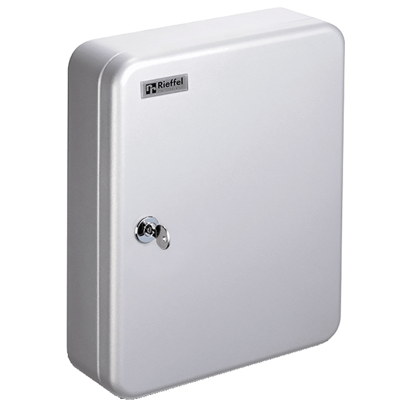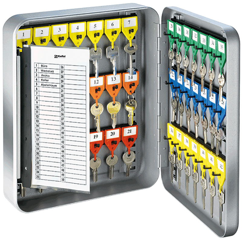 Stahlgehäuse silbergrau, Stiftzylinderschloss mit 2 Schlüssel, Türe kann 180° geöffnet werden, mit schwenkbarem Schlüsselverzeichnis, verstellbaren Hakenleisten, bereits aufgeklebte Nummernstreifen für Hakenleisten, jede Hakenleiste mit eigener Farbe, mit Nummernetiketten, mit Schlüsselanhänger in gleicher Farbe wie Hakenleistenstreifen, mit Befestigungsmaterial
