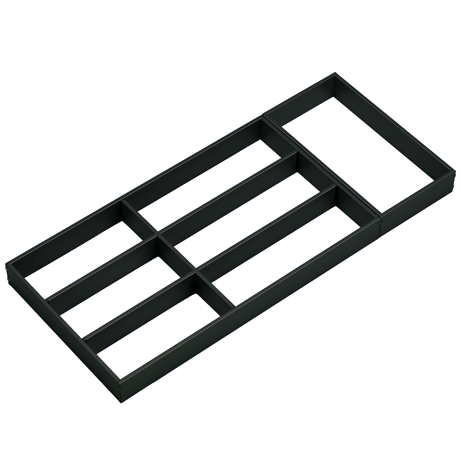 acier, un cadre parfait pour l'organisation des tiroirs, qu'il s'agisse d'un, de deux ou de trois éléments, avec le système de cadre Tavinea Sorto, l'organisation de tiroirs de toute largeur devient rapide et simple, les éléments de cadre sont formés de profils métalliques de 6 mm dont la forme fait un point de mire fonctionnel, design épuré, surfaces mates, couleurs intemporelles, l'élégance sobre du système de cadres confère aux meubles de cuisine, de salle de bain, du séjour comme à ceux de la chambre à coucher une apparence toujour aussi soignée, le connecteur d'angl e est à la fois un élément espaceur et antidéparant, le matériau, la forme, la couleur et la surface sont identiques et idéal de tous les systèmes de tiroirs de Grass, un mécanisme à ressort à l'intérieur de la traverse permet un positionnement libre du séparateur longitudinal fin, c'est ainsi que l'on peut créer avec une seule traverse deux compartiments supplémentaires ou de maintenir à leur place des accessoires tels qu'un bloc à couteaux, un support de rouleau de film ou un escalier à épices, sans traverse