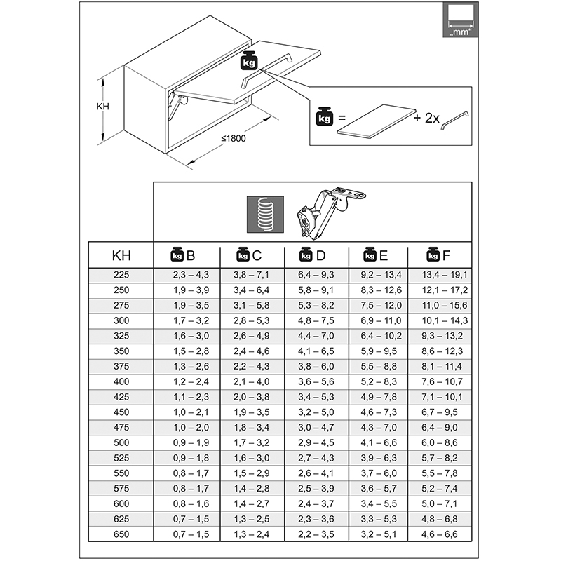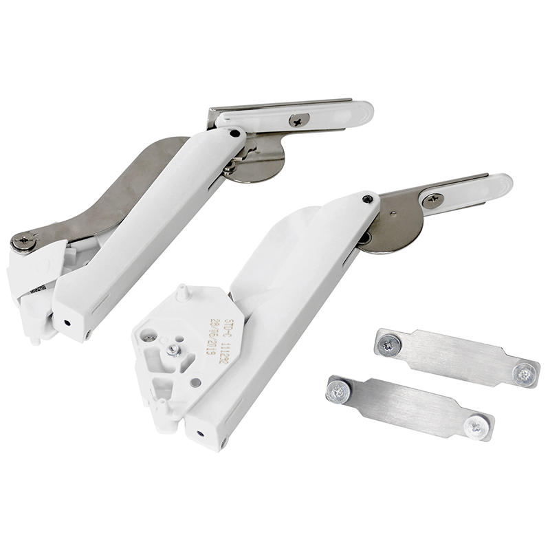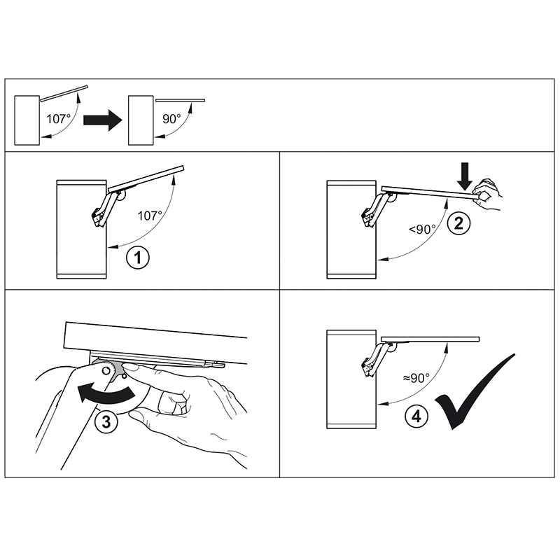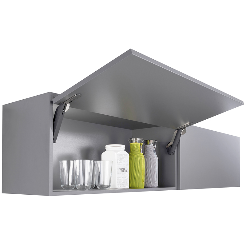 ferrure d'abattant mince, filigrane et en même temps solide pour les façades sans charnières, profondeur de montage réduite (63 mm), maintien fiable dans toutes les positions grâce à une force de ressort réglable avec précision grâce à la fonction d'arrêt à plusieurs positions, la faible résistance à l'ouverture et la facilité de fonctionnement assurent un grand confort d'utilisation, l'amortissement de fermeture intégré adapté à l'ensemble des applications assure une fermeture douce et silencieuse de l'abattant, alignement de la façade avec le mécanisme de réglage 3D, sans outil, angle d'ouverture utilisable (107°), le mécanisme intégré peut être limité à 90°