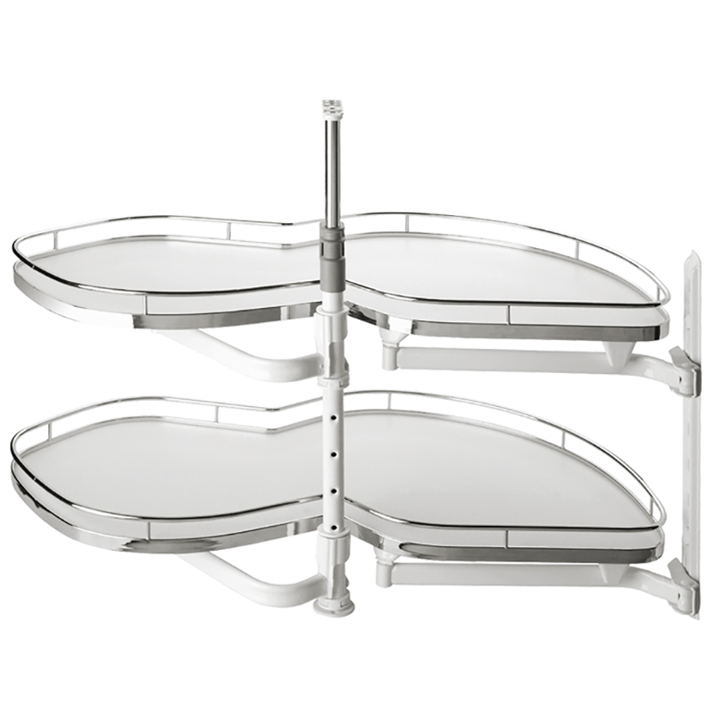 solution d'armoire d'angle innovante en fil d'acier et bois, revêtement par poudre, pour meubles avec portes à charnières, ferrure fonctionnelle de haute qualité pour meubles d'une hauteur intérieure de 600 - 750 mm et d'une profondeur de 500 mm min., technique de montage ClickFixx, angle d'ouverture de porte de 85° min., les tablettes sont réglables en hauteur sans outil, les deux tablettes pivotent en douceur hors du meuble en un seul mouvement et peuvent être déplacées indépendamment l'une de l'autre, capacité de charge par tablette 25 kilos, peut être équipée en option d'un amortisseur Softstopp, sans amortisseur