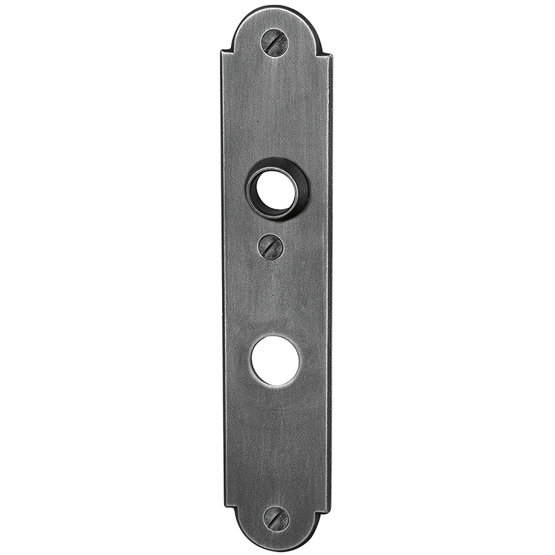 Fer zingué et patiné vieux sans vis, avec plaquette anti-percement et rosace de protection pour le cylindre, distance du milieu du trou de vis du haut au milieu du trou de poignée 74,5 mm