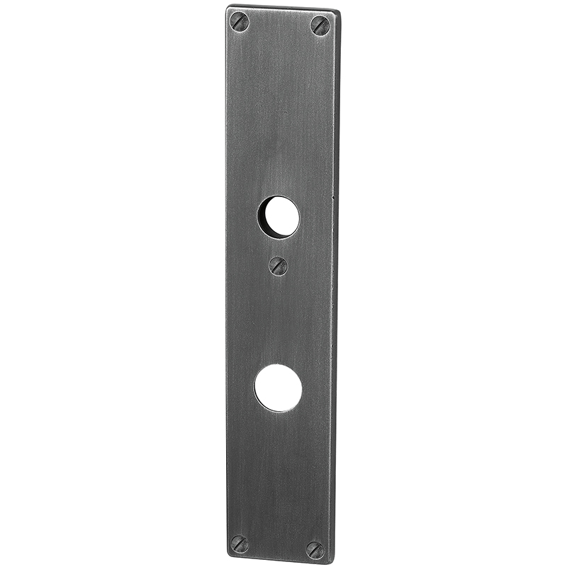 Fer zingué et patiné vieux sans vis, avec plaquette anti-percement et rosace de protection pour le cylindre, distance du milieu du trou de vis du haut au milieu du trou de poignée 84 mm