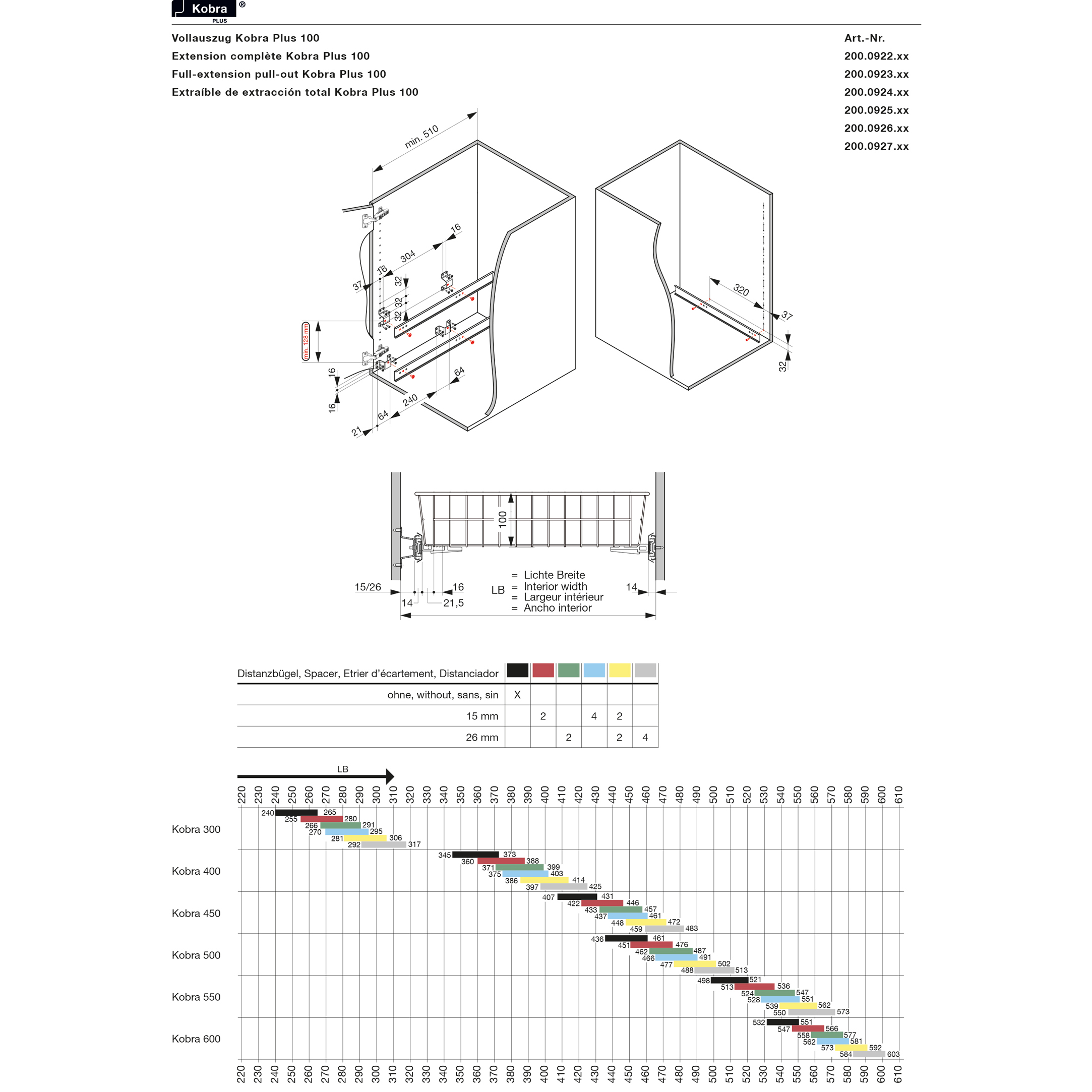 Avec extension totale coloris argent, avec amortisseur Softstopp et retour automatique, résistance à la charge 20 kg, système d'extension de panier réglable en largeur grâce à des clips de montage, plage de réglage de
