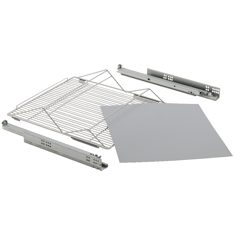 Extension totale, galvanisé, Blum Tandem plus avec softstop et rentrée automatique Blumotion, force portante 30 kilos, grille porte-souliers blanc RAL 9003, avec natte du fond gris clair, sans accessoires