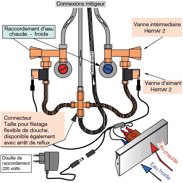 - Les mitigeurs déjà installés ou neufs peuvent en être équipés. Conditions préalables: Mitigeur avec douche à extension, hauteur du socle min. 80 mm, prise 230 volts.