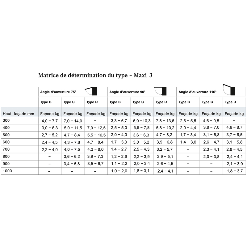 - Poids de la façade = poids d'abattant + 2x poids de la poignée.