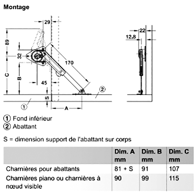 Acier nickelé, angle d'ouverture 90°, avec pied angulaire pour abattants en bois, avec plaque à visser pour abattants en cadre aluminium, avec effet de freinage réglable en tournant la vis