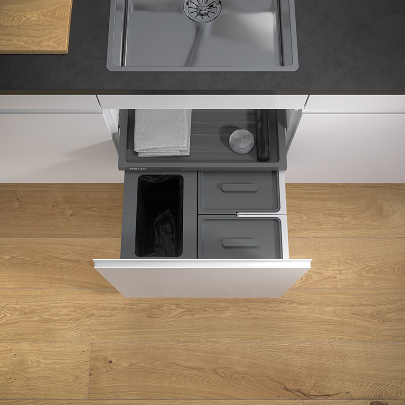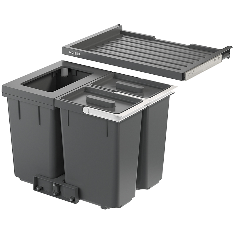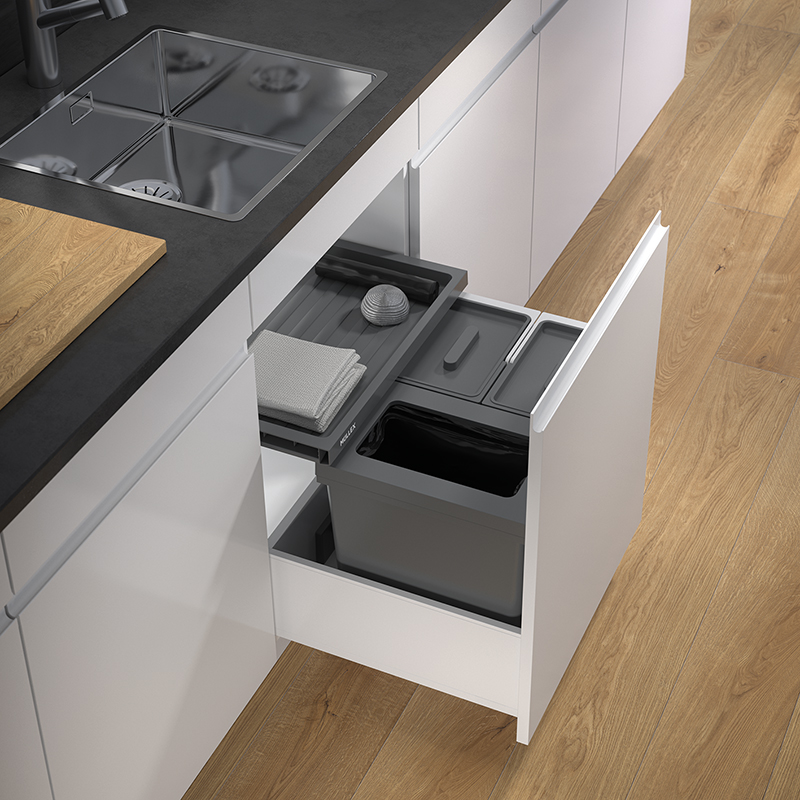 Anthracite. Cet ensemble de X-LINE a été conçu pour les ménages qui préfèrent une collecte de déchets avec des sacs-poubelle de 17 litres et ont donc besoin d’un plus petit récipient principal. Le récipient principal de ce système de tri de déchets ne pouvant contenir que 20 litres permet d’obtenir encore plus d’espace pour les matières recyclables. Deux récipients supplémentaires de 10 litres offrent de la place pour les déchets biodégradables, les capsules de café et les pastilles pour lave-vaisselle, mais aussi pour les ustensiles de nettoyage et autres. Le système de tri de déchets est conçu pour les armoires de cuisine inférieures de faible hauteur avec une largeur de caisson de 550 mm et comprend un tiroir Basic pour une surface de rangement supplémentaire.