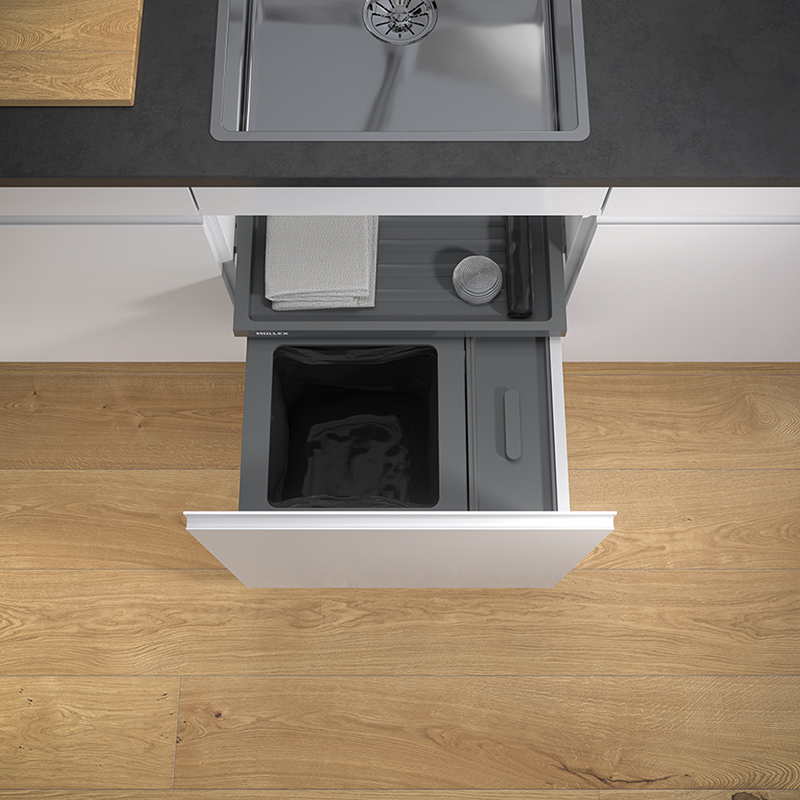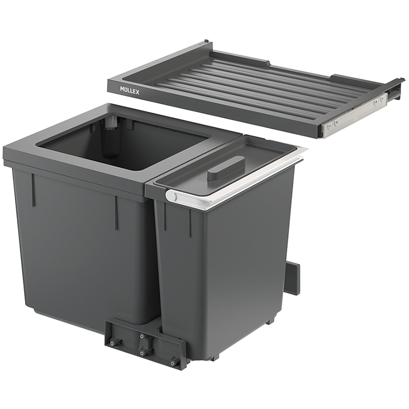 Anthracite. Pour chaque tiroir coulissant du commerce avec une profondeur de tiroir de 400 - 500 mm. Pour épaisseur de paroi de caisson 16 / 19 mm. Le set X-LINE propose, en plus du bac principal, un bac supplémentaire de 11,5 litres pour les ménages qui ont besoin d'encore plus de place pour le recyclage ou le stockage. Le conteneur supplémentaire extra large a été spécialement conçu pour les ménages qui préfèrent un seul conteneur supplémentaire avec plus d'espace de rangement. Grâce à sa hauteur réduite, l'ensemble convient aux cuisines avec des tiroirs coulissants bas. Le récipient principal de ce modèle X-LINE pour les largeurs de corps de 550 mm offre, avec son volume de 35 litres, un espace optimal pour le sac poubelle. Le système de collecte des déchets dispose d'un espace de rangement supplémentaire grâce au tiroir Basic intégré. La fixation des sacs est facilitée par quatre tendeurs de sacs mobiles.
