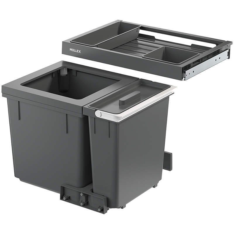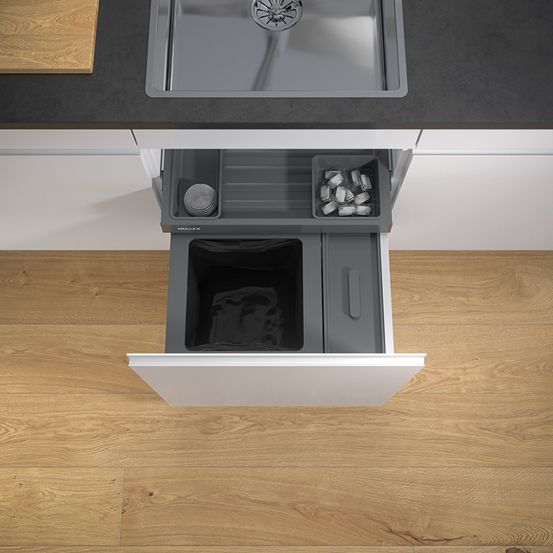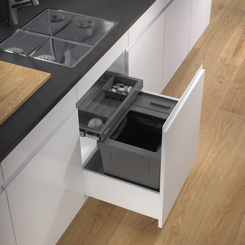 Anthracite. Pour chaque tiroir coulissant du commerce avec une profondeur de tiroir de 400 - 500 mm. Pour épaisseur de paroi de caisson 16 / 19 mm. Cette garniture offre tous les avantages de la X-LINE pour tiroirs bas. Conçu pour une largeur de caisson de 550 mm, le système de collecte ne convainc pas seulement par les caractéristiques incomparables de X-LINE, mais aussi par le très grand récipient supplémentaire. Le récipient d'un volume de 11,5 litres réunit les petits récipients de la version d'origine X-LINE en un nouveau grand récipient. Le résultat est un récipient extra-large pour les produits recyclés ou les ustensiles de nettoyage. Comme tous les produits X-LINE, la garniture comprend également le récipient principal pour le sac poubelle. Le système de collecte des déchets est complété par un tiroir haut de gamme à sortie totale. La fixation des sacs est facilitée par quatre tendeurs de sacs mobiles.