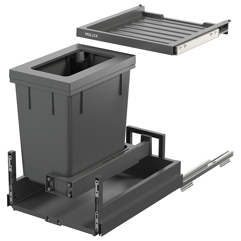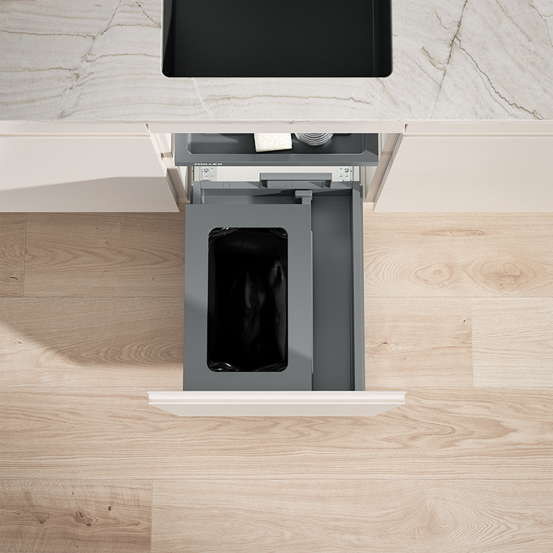 Ce système complet est l’économiseur de place par excellence de la X-LINE, le système extra-compact a été conçu pour une largeur de caisson de 400 mm seulement, il est donc idéal pour les situations de montage étroites, les petites cuisines et les faibles quantités de déchets ménagers, le récipient principal de 20 litres est conçu pour des sacs-poubelle standard de 17 litres et est complété par le tiroir Basic, le système est fourni avec le tiroir complet Pro robuste