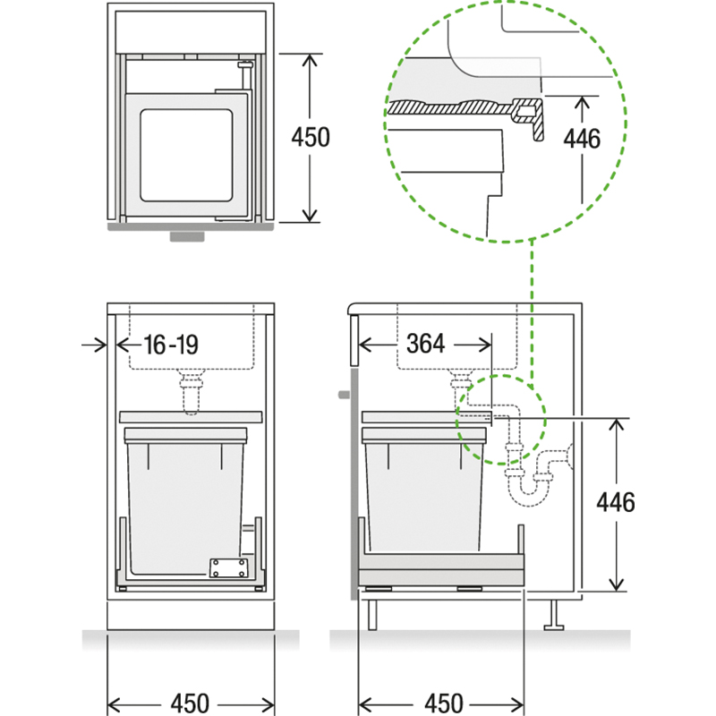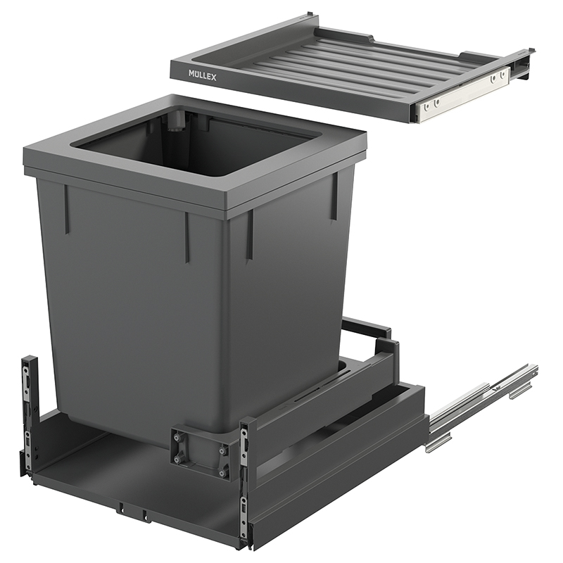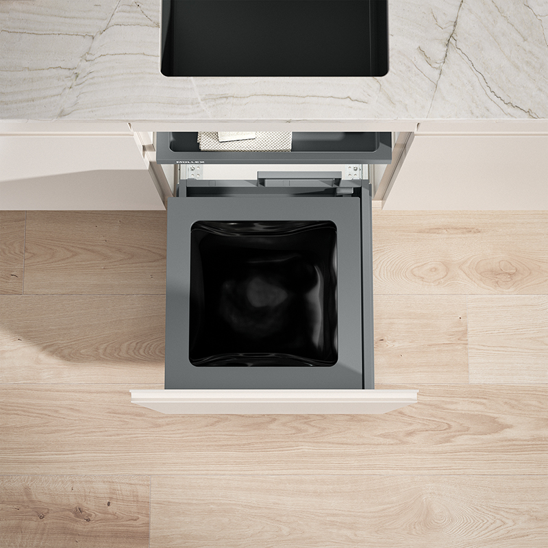 L’ensemble complet offre la bonne solution pour les caissons de cuisine étroits, ce modèle peut déjà être utilisé à partir d’une largeur de caisson de 450 mm, le récipient principal d’une capacité de 40 litres convient pour sacs taxés suisses de 35 ou 17 litres, le tiroir stable Basic crée un espace de rangement supplémentaire lorsqu’il y a peu de place disponible, les récipients sont particulièrement faciles à installer grâce à l’ingénieux système de cliquet X-LINE, même dans un petit espace, ce modèle offre une élimination pratique des déchets grâce à sa technologie de pointe, le système est fourni avec le tiroir complet Pro robuste