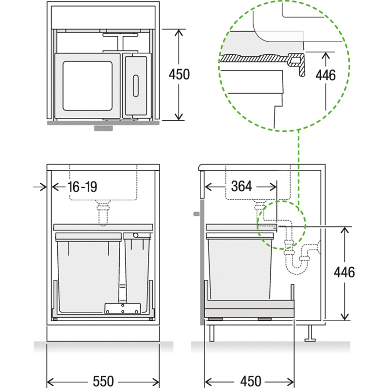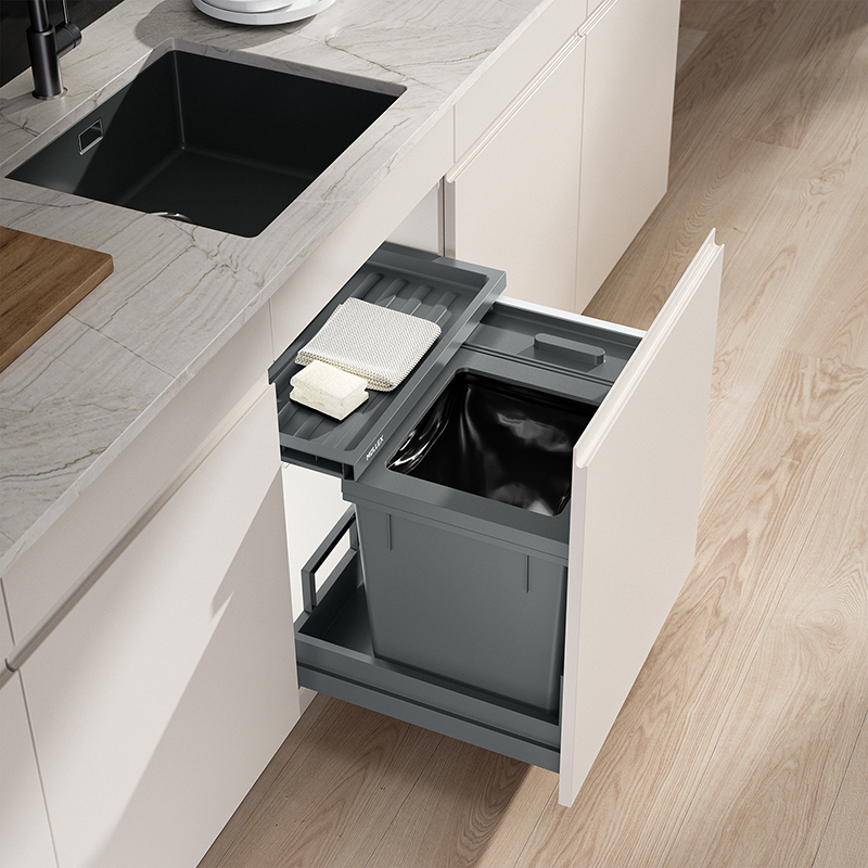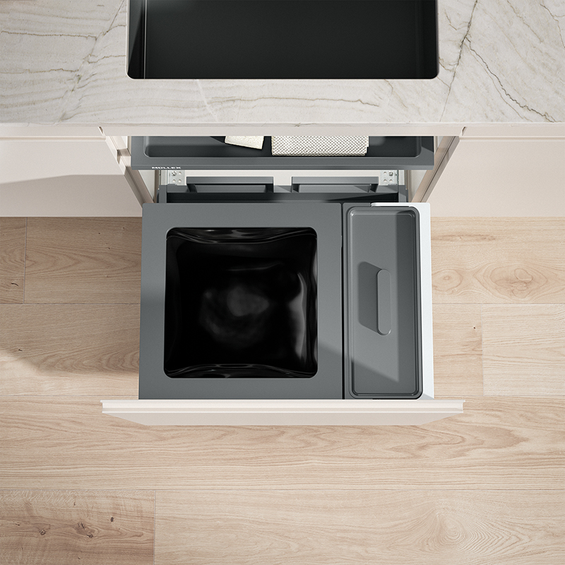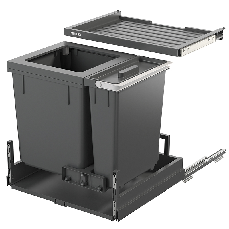 Cet ensemble complet pour largeur de caisson de 550 mm propose un grand récipient supplémentaire pour encore plus d’espace de recyclage et de rangement, équipé d’un récipient principal de 40 litres et d’un récipient supplémentaire de 12,5 litres, le système de tri de déchets offre un espace suffisant pour les déchets ménagers mixtes et les matières recyclables, le tiroir Basic offre un espace de rangement supplémentaire pour les éponges de rinçage et autres, le système est fourni avec le tiroir complet Pro robuste