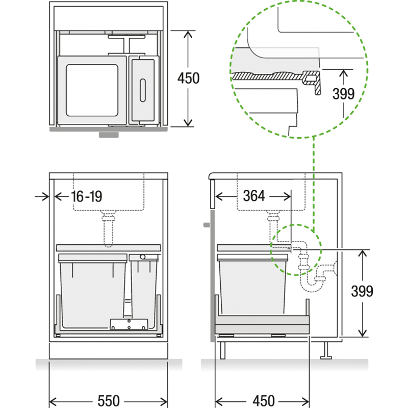 Cet ensemble complet pour largeur de caisson de 550 mm propose un grand récipient supplémentaire pour encore plus d’espace de recyclage et de rangement, équipé d’un récipient principal de 35 litres et d’un récipient supplémentaire de 11,5 litres, le système de tri de déchets offre un espace suffisant pour les déchets ménagers mixtes et les matières recyclables, le tiroir Basic offre un espace de rangement supplémentaire pour les éponges de rinçage et autres, le système est fourni avec le tiroir complet Pro robuste