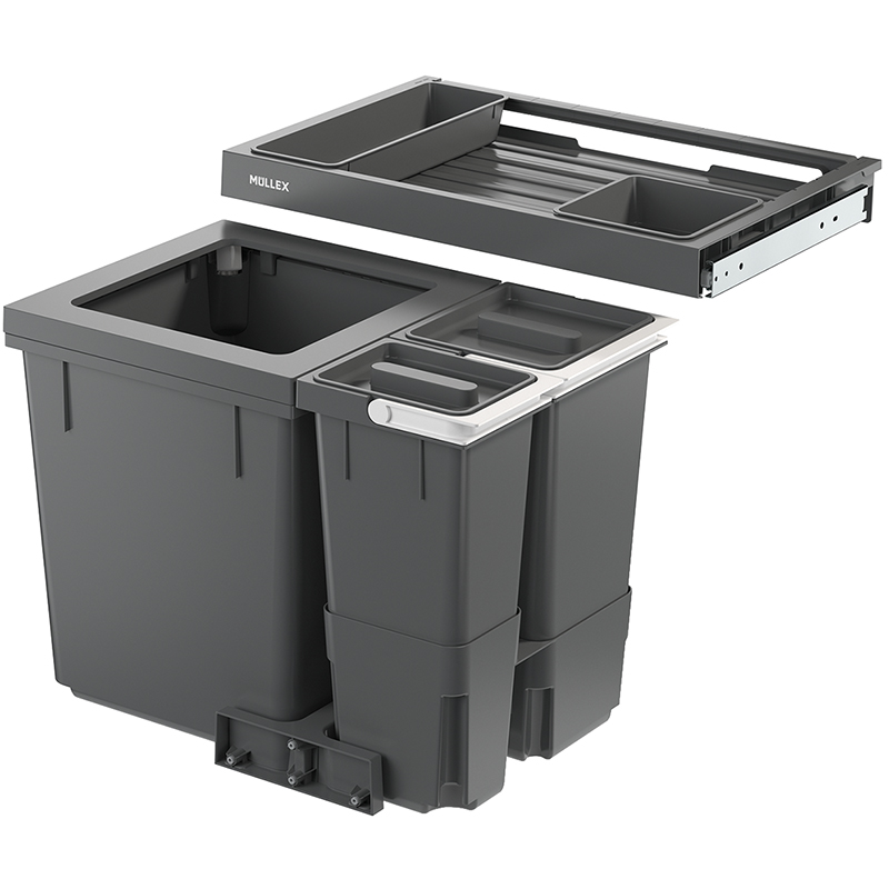 anthracite, pour tout tiroir coulissant standard d'une profondeur de 400 - 500 mm, pour une épaisseur de paroi d'armoire de 16 / 19 mm, ce modèle Premium pour une largeur d'armoire de cuisine de 600 mm est la Rolls Royce de la nouvelle X-Line, plus de 18 litres d'espace de rangement sont disponibles en plus du récipient principal de 40 litres, les six récipients supplémentaires individuels permettent la collecte de différentes matières recyclables plus petites et offrent également un espace de rangement suffisant pour les ustensiles de cuisine, les pastilles pour le lave-vaisselle, grâce au principe du "récipient dans le récipient", tous les conteneurs sont facilement accessibles malgré leur conception à faible encombrement, fixation du sac plus aisée avec quatre tendeurs de sac mobiles, sacs à déchets remplis à ras bord, les sacs taxés de 35 ou 17 litres deviennent vraiment pleins, jusqu'à sept options de recyclage et 31% deplus d'espace de rangement que les systèmes comparables, plus d'ordre et de confort, deux bacs supplémentaires sur un tiroir à roulement à billes à extension totale