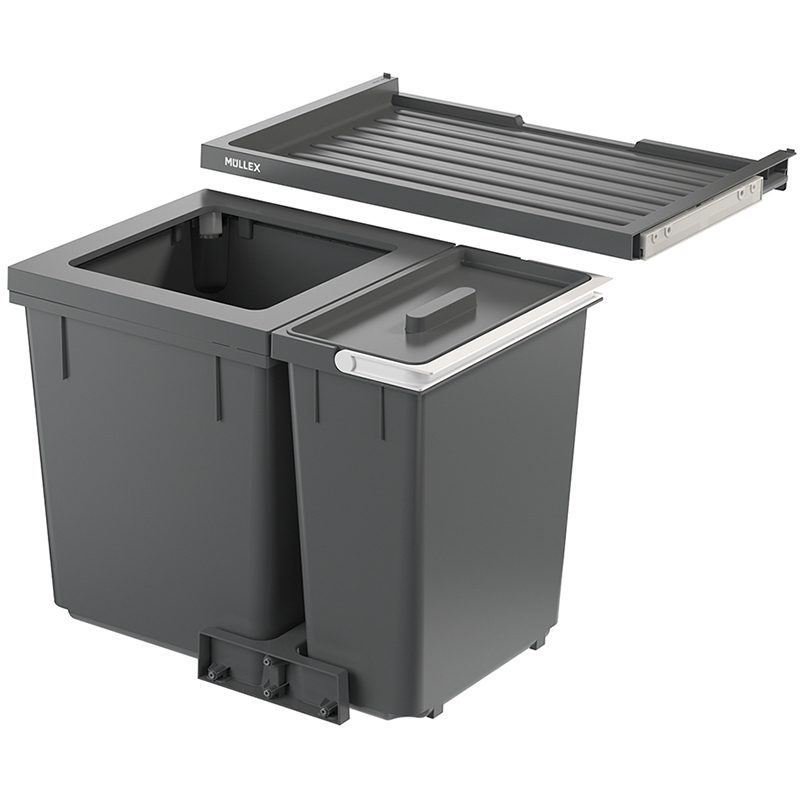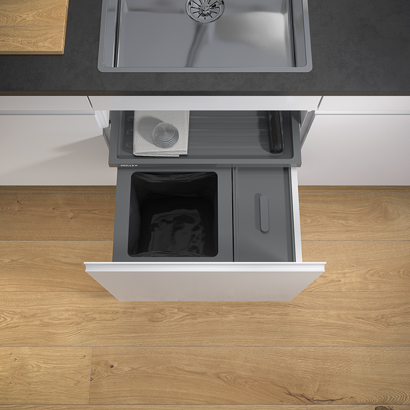 Anthracite. Pour chaque tiroir coulissant du commerce avec une profondeur de tiroir de 400 - 500 mm. Pour épaisseur de paroi de caisson 16 / 19 mm. Ce modèle X-LINE pour corps de meuble d'une largeur de 600 mm convainc par son très grand bac supplémentaire. Le récipient supplémentaire permet de ranger de grandes quantités de déchets biologiques, de produits recyclés ou d'ustensiles de nettoyage. La pièce maîtresse du set est le récipient principal de 40 litres pour les déchets ménagers normaux. Ce système de collecte est complété par le tiroir Basic pour encore plus de surface de rangement et d'espace de stockage. La fixation des sacs est facilitée par quatre tendeurs de sacs mobiles. Les sacs taxés de 35 ou 17 litres sont correctement remplis dans le récipient principal de 40 litres.