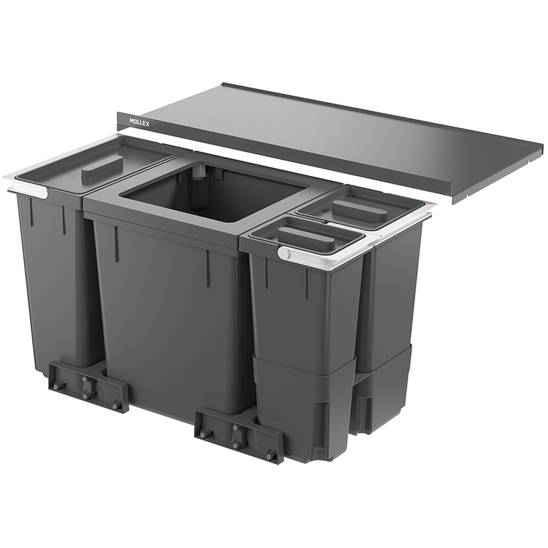 anthracite, pour tout tiroir coulissant standard d'une profondeur de 400 - 500 mm, pour une épaisseur de paroi d'armoire de 16 / 19 mm, pour les caissons plus larges d'une largeur de 800 mm, le collecteur de déchets X80 L6 Basic veille à l'ordre dans l'armoire de cuisine, le récipient principal de 40 litres est complété par cinq autres récipients, grâce à un volume allant jusqu'à 18 litres, ils conviennent pour les déchets biologiques et les matières recyclables de plus petite taille ainsi que pour le rangement d'ustensiles de cuisine, fixation du sac plus aisée avec quatre tendeurs de sac mobiles, sacs à déchets remplis à ras bord, les sacs taxés de 35 ou 17 litres deviennent vraiment pleins, quatre récipients supplémentaires de jusqu'à 18 litres pour les matières recyclables et le rangement, couvercle métallique des récipients pour une plus grande stabilité