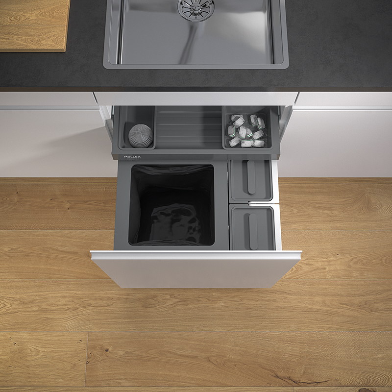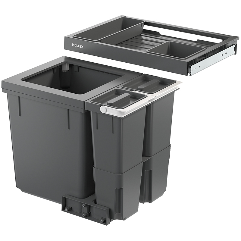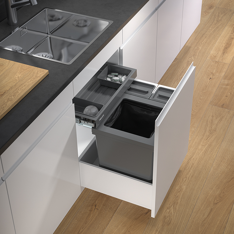 anthracite, pour tout tiroir coulissant standard d'une profondeur de 400 - 500 mm, pour une épaisseur de paroi d'armoire de 16 / 19 mm, avec six récipients supplémentaires, le collecteur de déchets X55 L5 Premium offre des possibilités presque illimitées de tri et de stockage de matières, les espaces de rangement supplémentaires sont particulièrement utiles pour collecter des matières recyclables plus petites telles que des capsules de café, des déchets biodégradables ou des piles, les ustensiles de nettoyage et les accessoires de cuisine peuvent être rangés correctement, l'ensemble comprend également le récipient principal de 40 litres pour le sac poubelle, fixation du sac plus aisée avec quatre tendeurs de sac mobiles, sacs à déchets remplis à ras bord, les sacs taxés de 35 ou 17 litres deviennent vraiment pleins, jusqu'à sept options de recyclage et 31% deplus d'espace de rangement que les systèmes comparables, plus d'ordre et de confort, deux bacs supplémentaires sur un tiroir à roulement à billes à extension totale