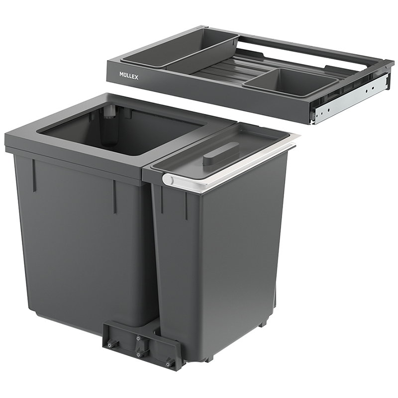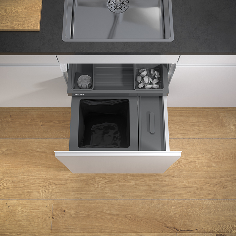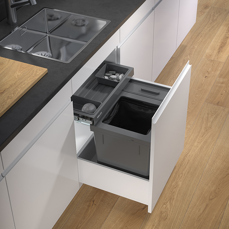 Anthracite. Pour chaque tiroir coulissant du commerce avec une profondeur de tiroir de 400 - 500 mm. Pour épaisseur de paroi de caisson 16 / 19 mm. Ce système de collecte des déchets pour des largeurs de corps de 550 mm dispose, avec le récipient supplémentaire de 12,5 litres, d'un lieu de rangement volumineux pour les produits recyclés ou les ustensiles de nettoyage. Ce récipient extra-large est idéal pour les grandes quantités de déchets organiques ou comme espace de rangement supplémentaire dans le meuble bas de la cuisine. Le récipient principal de 40 litres pour le sac poubelle constitue le cœur du système de collecte des déchets. Le tiroir premium intégré dans le set avec extension totale peut être utilisé comme surface de rangement pour les éponges à vaisselle ou autres. Le serrage des sacs est plus facile grâce à quatre tendeurs de sacs mobiles. Les sacs taxés de 35 ou 17 litres se remplissent correctement dans le récipient principal de 40 litres.