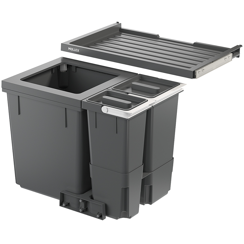 anthracite, pour tout tiroir coulissant standard d'une profondeur de 400 - 500 mm, pour une épaisseur de paroi d'armoire de 16 / 19 mm, cet ensemble pour caissons de 600 mm de large comprend possibilités de recyclage d'une contenance de 8, 5, 1,6 et 1,5 litres, en fonction des besoins personnels et du tri individuel des matières, des capsules de café, des pastilles pour le lave-vaisselle ou des déchets biologiques, par exemple, peuvent y être consignés, le récipient principal pour le sac poubelle avec un volume de 40 litres est idéal pour les sacs poubelle taxés, fixation du sac plus aisée avec quatre tendeurs de sac mobiles, sacs à déchets remplis à ras bord, les sacs taxés de 35 ou 17 litres deviennent vraiment pleins, tiroir Basic comme espace de rangement supplémentaire