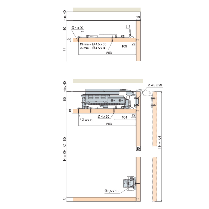 Ferrure de porte coulissante affleurante pour meubles hauts de cuisine HAWA Frontino 20 H Forslide