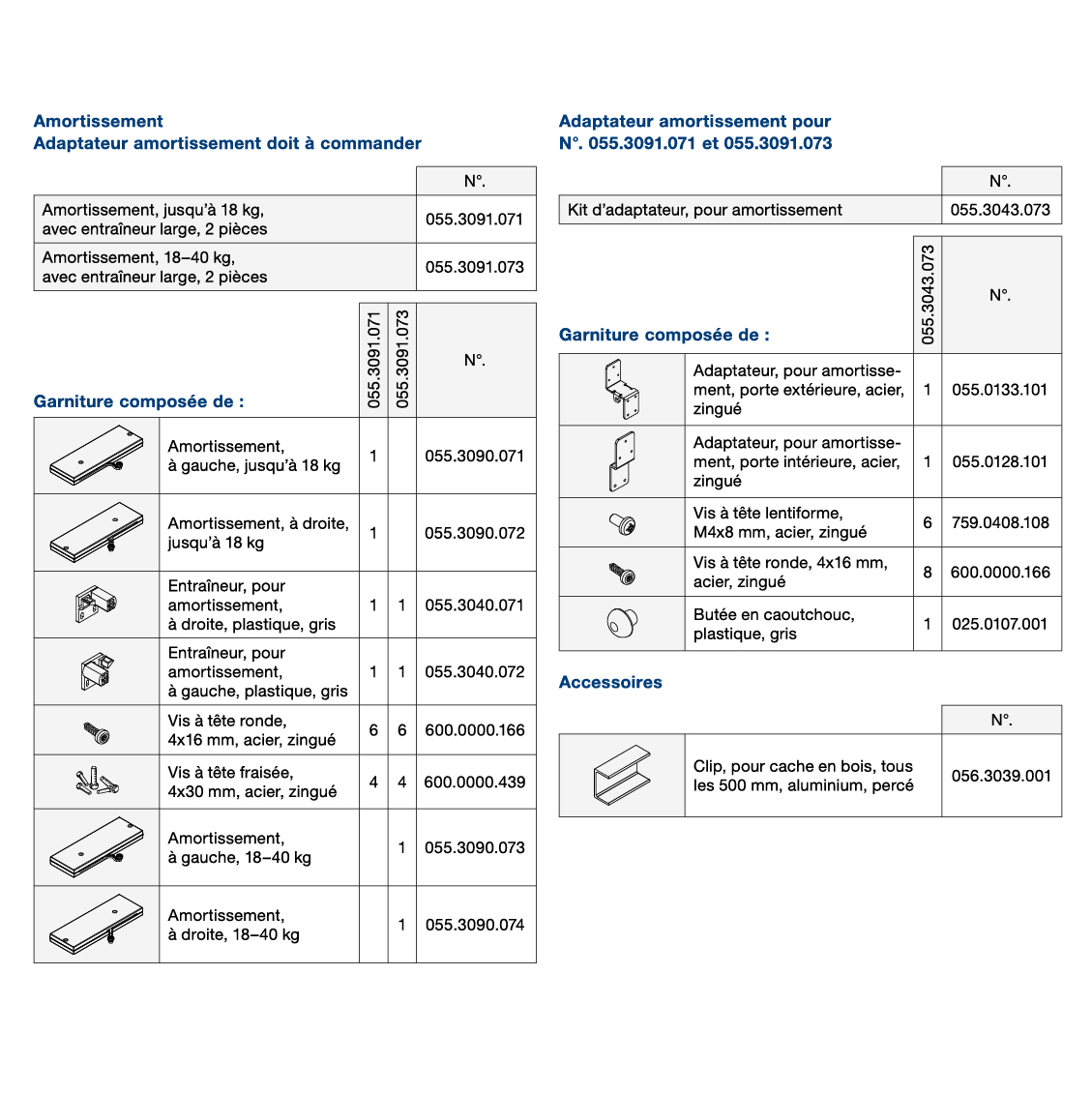 Pour portes d'armoire coulissantes en bois jusqu'à 35 kg, entrant dans le corps en haut et devant le corps en bas, épaisseur de porte 19 mm, dimensions porte (largeur x hauteur) max. 1200 x 2200 mm, avec réglage en hauteur de l'excentrique ± 3 mm, sans rails de roulement et de guidage, sans cache-clips, sans accessoires