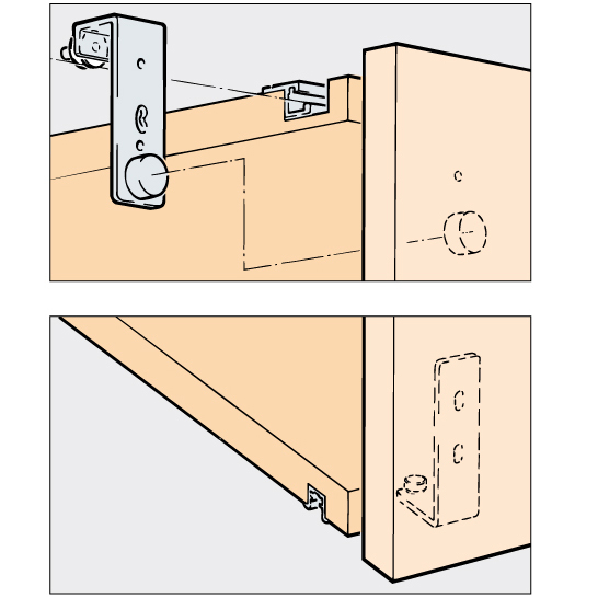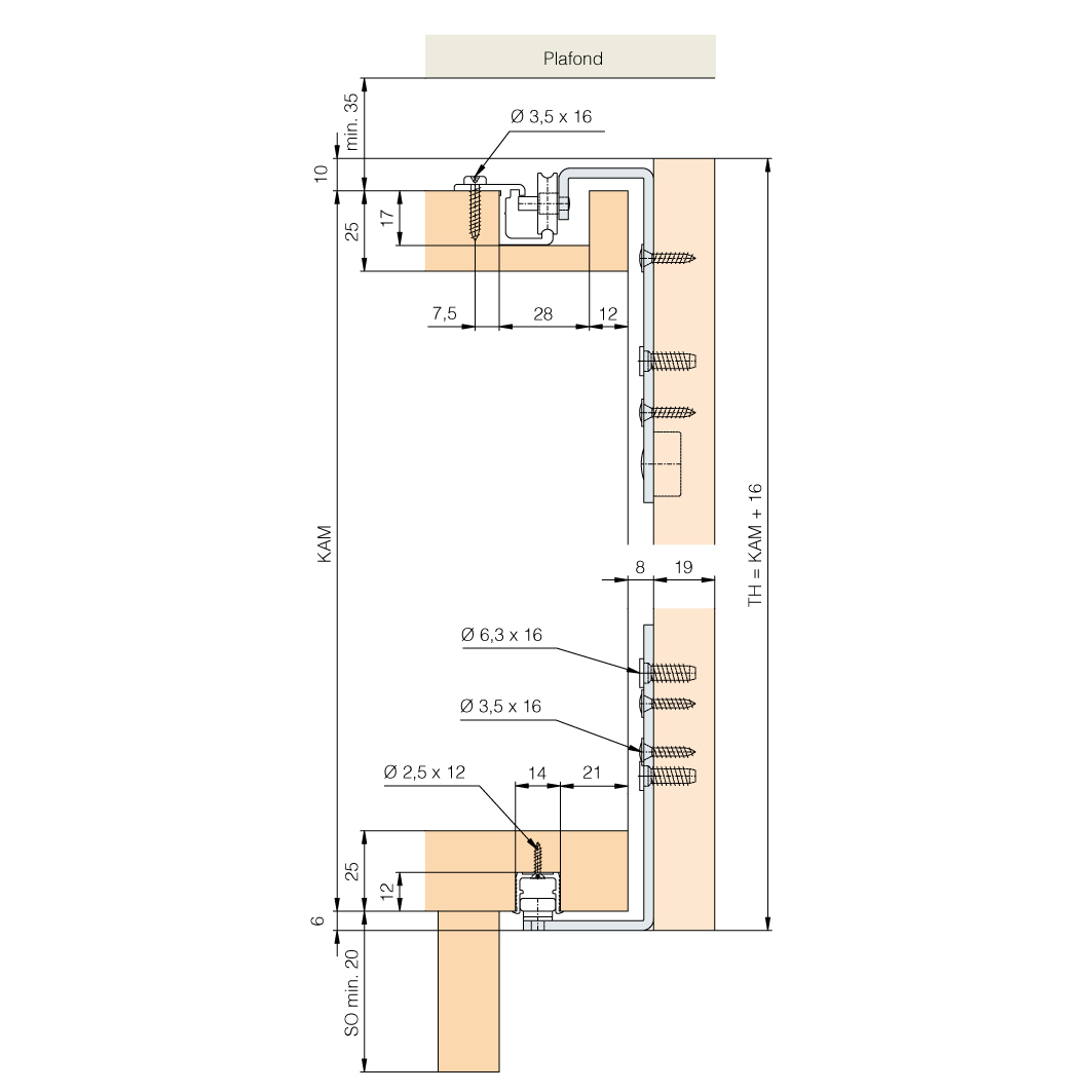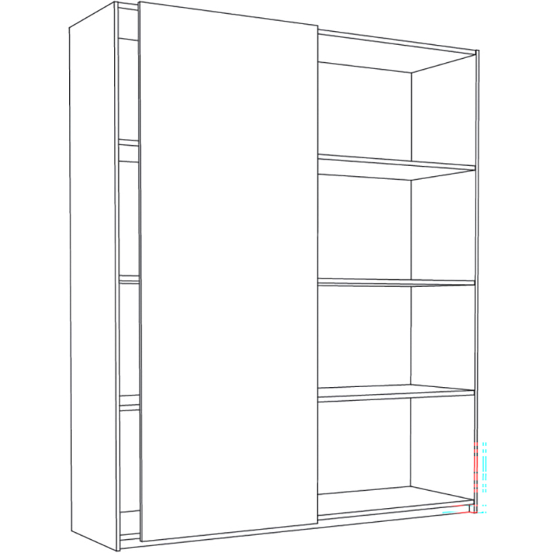 Pour portes d'armoire coulissantes en bois jusqu'à 25 kg, épaisseur de bois 19 - 25 mm, dimensions porte (largeur x hauteur) max. 1200 x 2400 mm, porte courant sur toute la hauteur devant l'étagère ou l'armoire, rails de roulement et de guidage recouverts, invisibles, sans rails de roulement et de guidage, sans accessoires