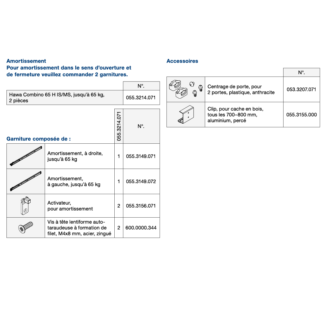 Ferrure de porte coulissante HAWA Combino 65 H Inslide, pour utilisation avec amortissement