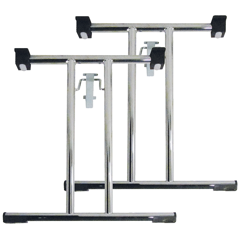 Tube en acier poli et chromé, pied en T droit avec 2 stabilisateurs au profil arrondi, avec angle glide noir pour compenser les irrégularités du sol 5 mm réglable, entretoises pour protéger les tables empilées, avec tampon en nylon avec plaque de vissage résistante et enclenchement automatique