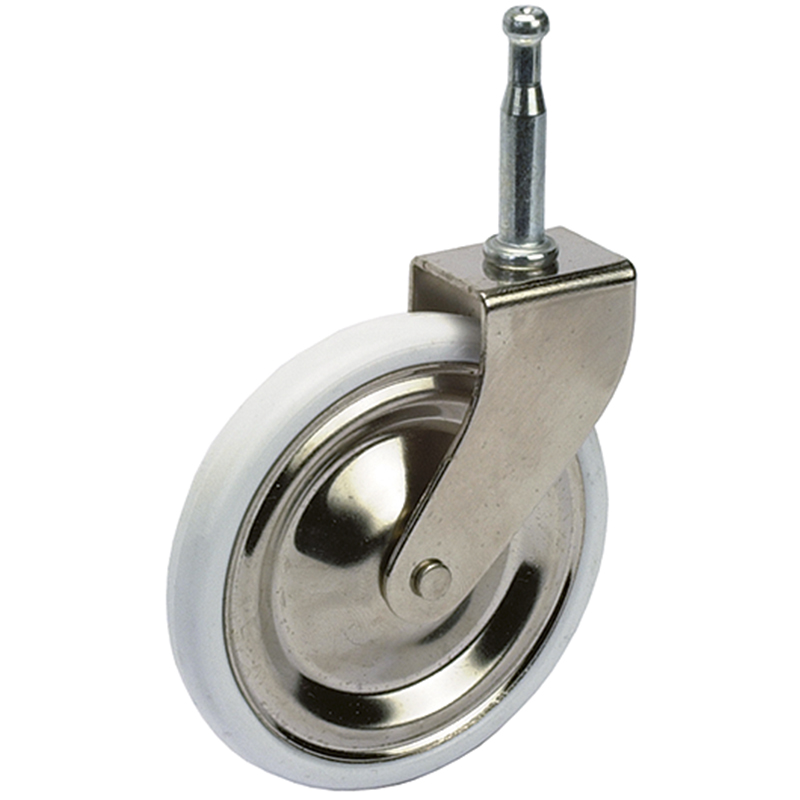 Fourche et disque de roue nickelés, bande de roulement en caoutchouc thermoplastique blanc, sans traces, essieu riveté, tige Ø 7 x 32 mm avec douille plastique noir ronde Ø 10 x 35 mm
