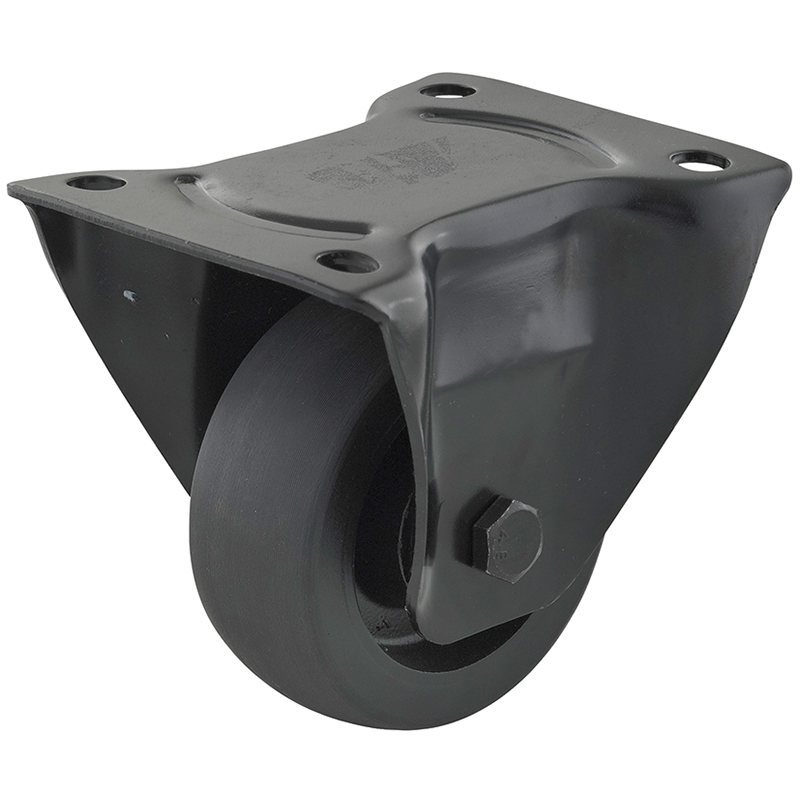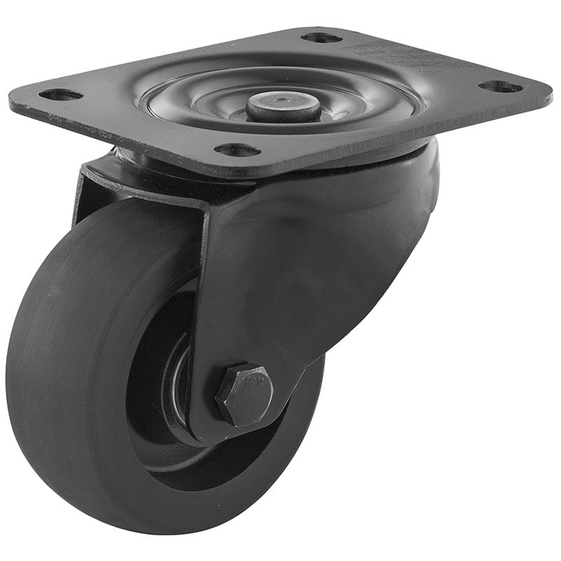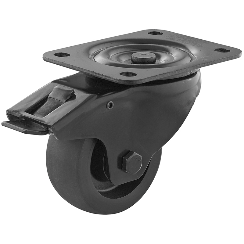 Carter en acier noir, chape avec double roulement à billes, bande de roulement en polyuréthane noir, faible sortie, corps de roue en aluminium coulé sous pression avec roulement à billes, résistant aux températures de -20° à +80° C
