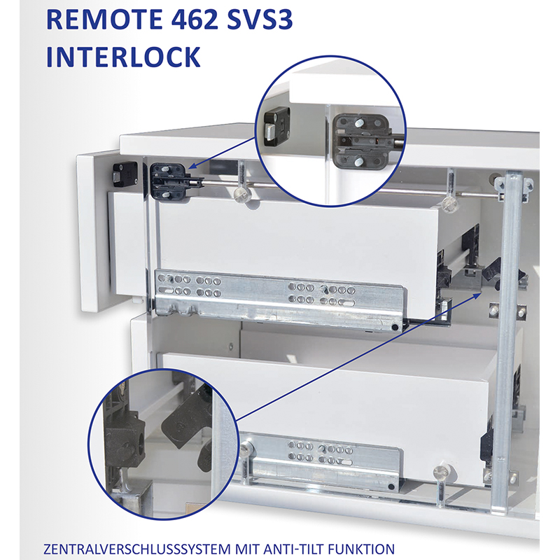 peut être utilisé dans différentes constructions d'armoires / tiroirs, verrouillage central à l'arrière, reposant sur le panneau latéral de l'armoire avec commande via les différents tiroirs, verrouillage avec une serrure à cylindre dans la façade du meuble, via un mécanisme de renvoi pour le verrouillage central, pour un design parfait, aucun autre composant n'est nécessaire et visible sur le système de cadre de haute qualité, la goupille de verrouillage n'est plus dans la zone visible, les tiges SVS peuvent être soit d'un seul côté à droite, peut être positionné à gauche ou des deux côtés (les deux côtés avec marche arrière), fonction anti-basculement comme protection contre les tiroirs à ouverture automatique sur les meubles mobiles non verrouillés, pour les pièces fermées, ne convient pas pour l'extérieur, température de + 5° à + 40° C avec une humidité relative de 30 à 80%, sans condensation, fermeture permanente 20'000 cycles selon la norme DIN EN 16014, convient aux bureaux de direction, aux laboratoires, aux cabinets médicaux et aux armoires à outils, sans accessoires