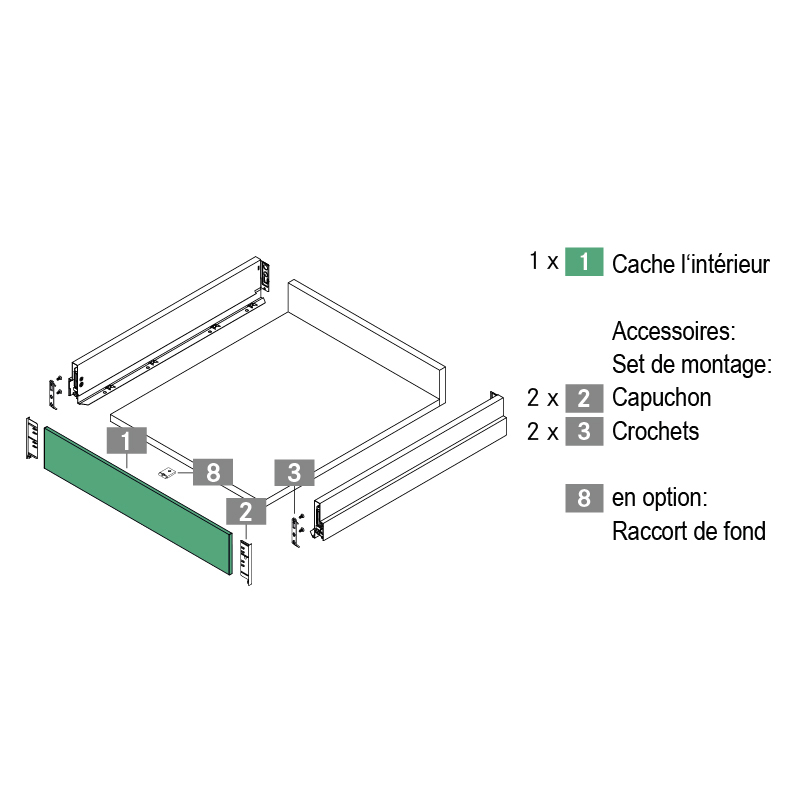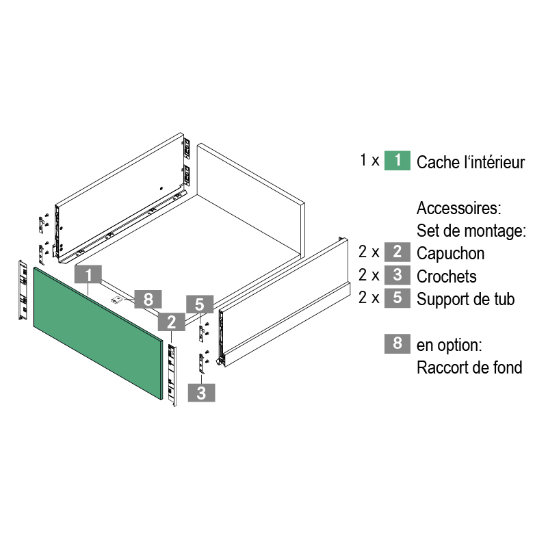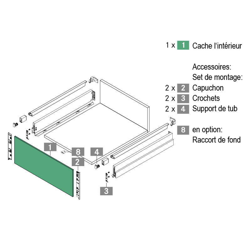 - Découpe: largeur façade = largeur intérieur de corps - 8 mm.