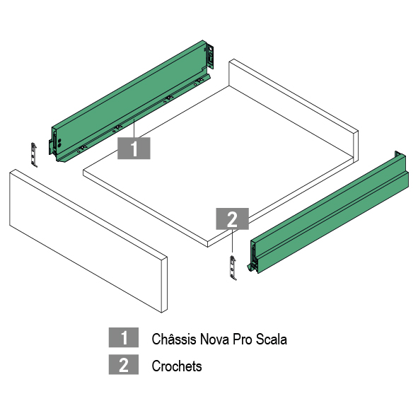 Ensemble comprenant: une règle de guidage et 4 éléments de butée. Pour toutes les coulisses corps de meuble Nova. Utilisation dans le corps monté; profondeur minimale du corps: 350 mm.