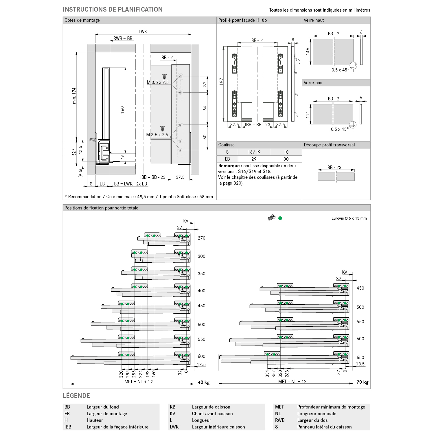 - Raccord de fond pour largeur du tiroir dès 600 mm 58.274.41 est recommandé.