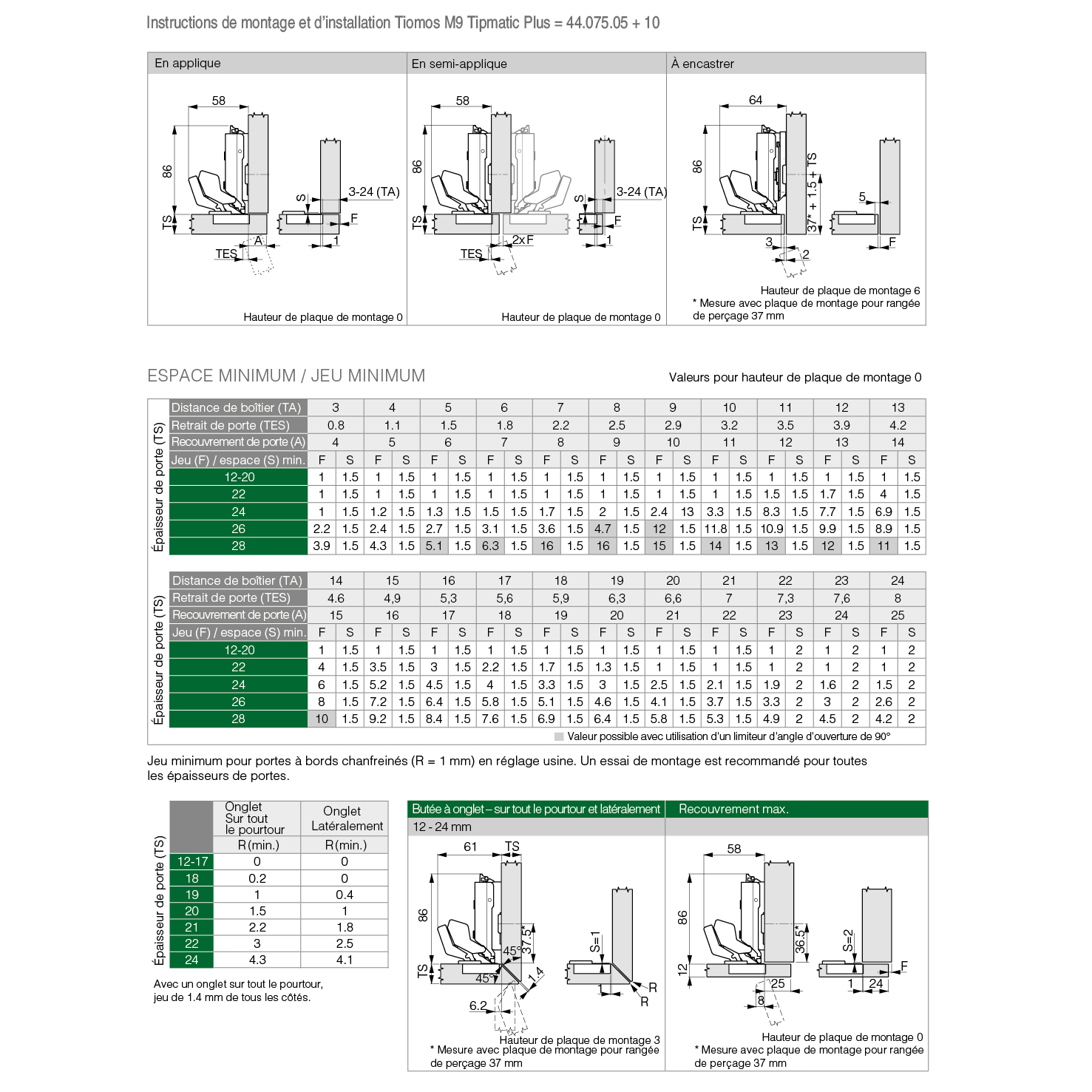 Charnière invisible GRASS® Tiomos M9 110° Tipmatic Plus Click-on, pour portes de meubles mince et butée à onglet 45°, image de perçage 45 / 9,5
