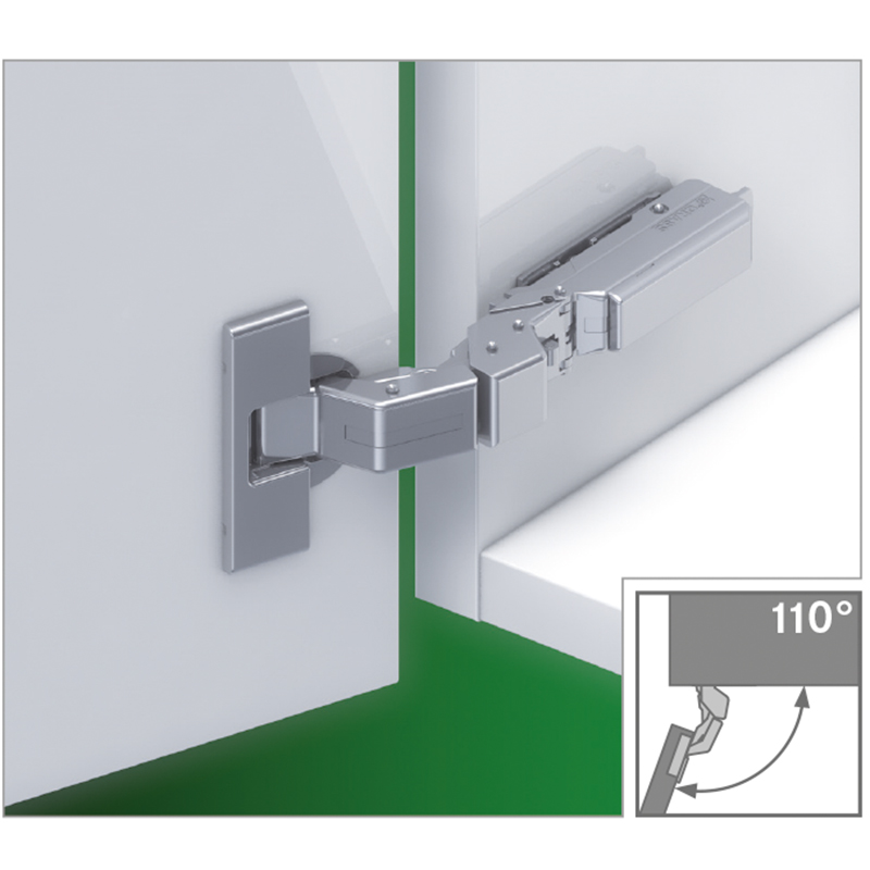 Zinc nickelé, boîtier à visser, peut être utilisé selon la hauteur de la plaque de base comme un charnière d'angle, centrale et intérieur, réglage tridimensionnel avec plaque de base correspondante, pour recouvrements de portes allant jusqu'à 28 mm, faible profondeur de charnière de 9 mm, sans cache protecteur pour bras de charnière, sans plaque de base