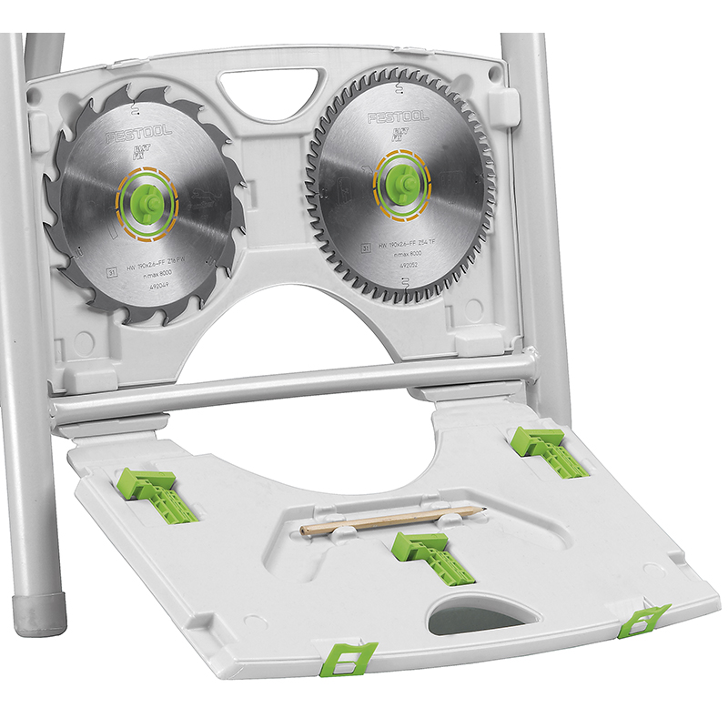 le coffre de rangement de lames est monté sur les pieds de la CS 50 et peut contenir jusqu'à 4 lames de scie, dans ce cas, les lames de scie sont toujours à portée de main et on les a toujours avec soi sur le chantier, possibilité de rabattre les pieds même si le coffre de rangement de lames est installé
